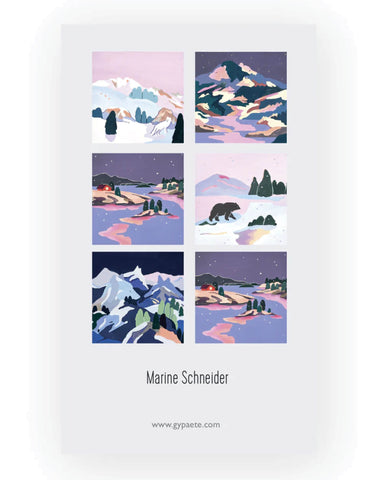 Pochette de 6 cartes postales "Les joies de l'hiver" réalisées en collaboration avec Marine Schneider. Cette collection de cartes illustrées (gouache, aquarelle et feutre) évoque le thème de l'hiver, des paysages enneigés et les fêtes de fin d'année.